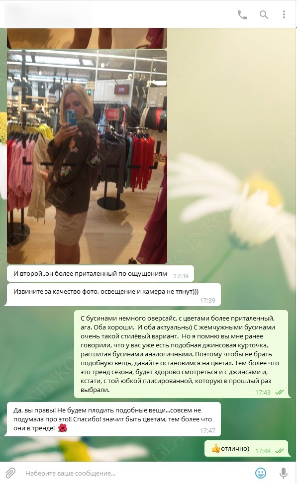 Напишите об этом как можно раньше, но не менее, чем за 24 часа. Получите подтверждение стилиста. Если вы отправляетесь, к примеру, на шопинг в выходной день и вам нужно, , чтобы стилист был с вами на связи, такой вариант возможен по предварительной договоренности со стилистом.